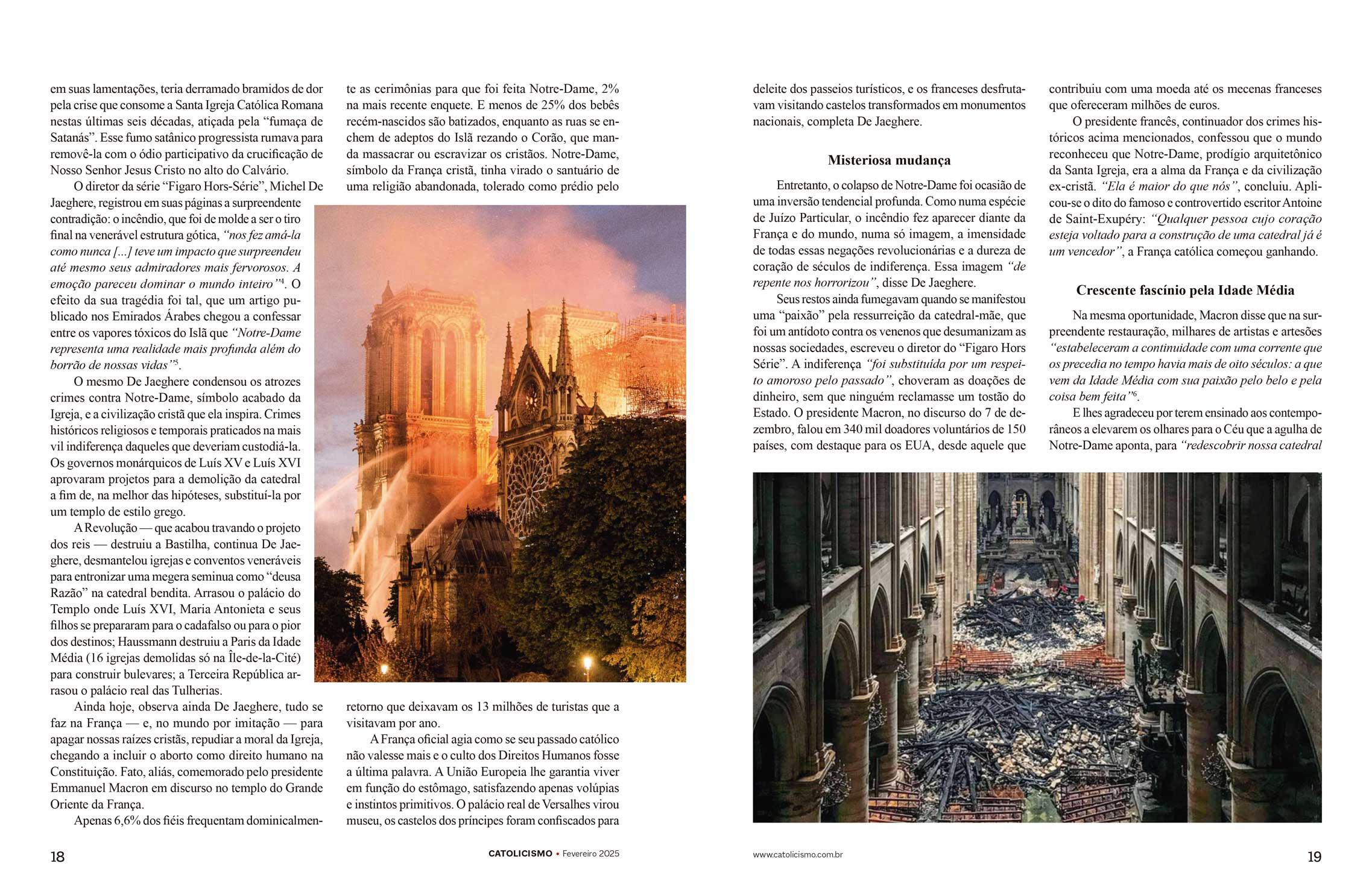 O diretor da série “Figaro Hors-Série”, Michel De Jaeghere, registrou em suas páginas a surpreendente contradição: o incêndio, que foi de molde a ser o tiro final na venerável estrutura gótica, “nos fez amá-la como nunca [...] teve um impacto que surpreendeu até mesmo seus admiradores mais fervorosos. A emoção pareceu dominar o mundo inteiro”4. O efeito da sua tragédia foi tal, que um artigo publicado nos Emirados Árabes chegou a confessar entre os vapores tóxicos do Islã que “Notre-Dame representa uma realidade mais profunda além do borrão de nossas vidas”5.