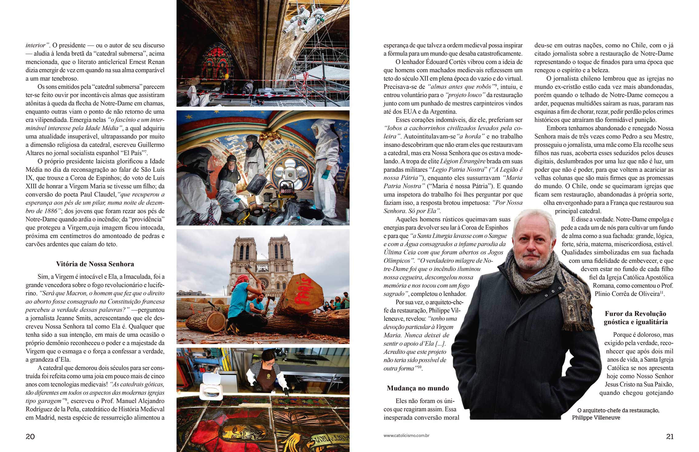 Embora tenhamos abandonado e renegado Nossa Senhora mais de três vezes como Pedro a seu Mestre, prosseguiu o jornalista, uma mãe como Ela recolhe seus filhos nas ruas, acoberta esses seduzidos pelos deuses digitais, deslumbrados por uma luz que não é luz, um poder que não é poder, para que voltem a acariciar as velhas colunas que são mais firmes que as promessas do mundo. O Chile, onde se queimaram igrejas que ficam sem restauração, abandonadas à própria sorte, olha envergonhado para a França que restaurou sua principal catedral.