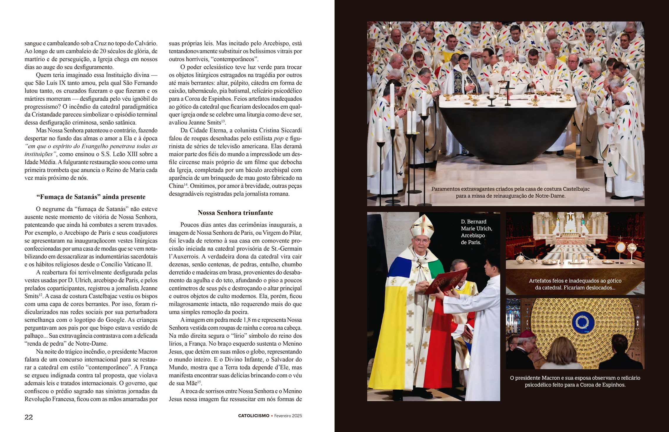 O negrume da “fumaça de Satanás” não esteve ausente neste momento de vitória de Nossa Senhora, patenteando que ainda há combates a serem travados. Por exemplo, o Arcebispo de Paris e seus coadjutores se apresentaram na inauguraçãocom vestes litúrgicas confeccionadas por uma casa de modas que se vem notabilizando em dessacralizar as indumentárias sacerdotais e os hábitos religiosos desde o Concílio Vaticano II.