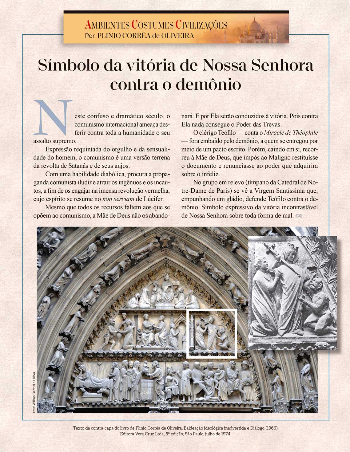 No grupo em relevo (tímpano da Catedral de Notre-Dame de Paris) se vê a Virgem Santíssima que, empunhando um gládio, defende Teófilo contra o demônio. Símbolo expressivo da vitória incontrastável de Nossa Senhora sobre toda forma de mal.