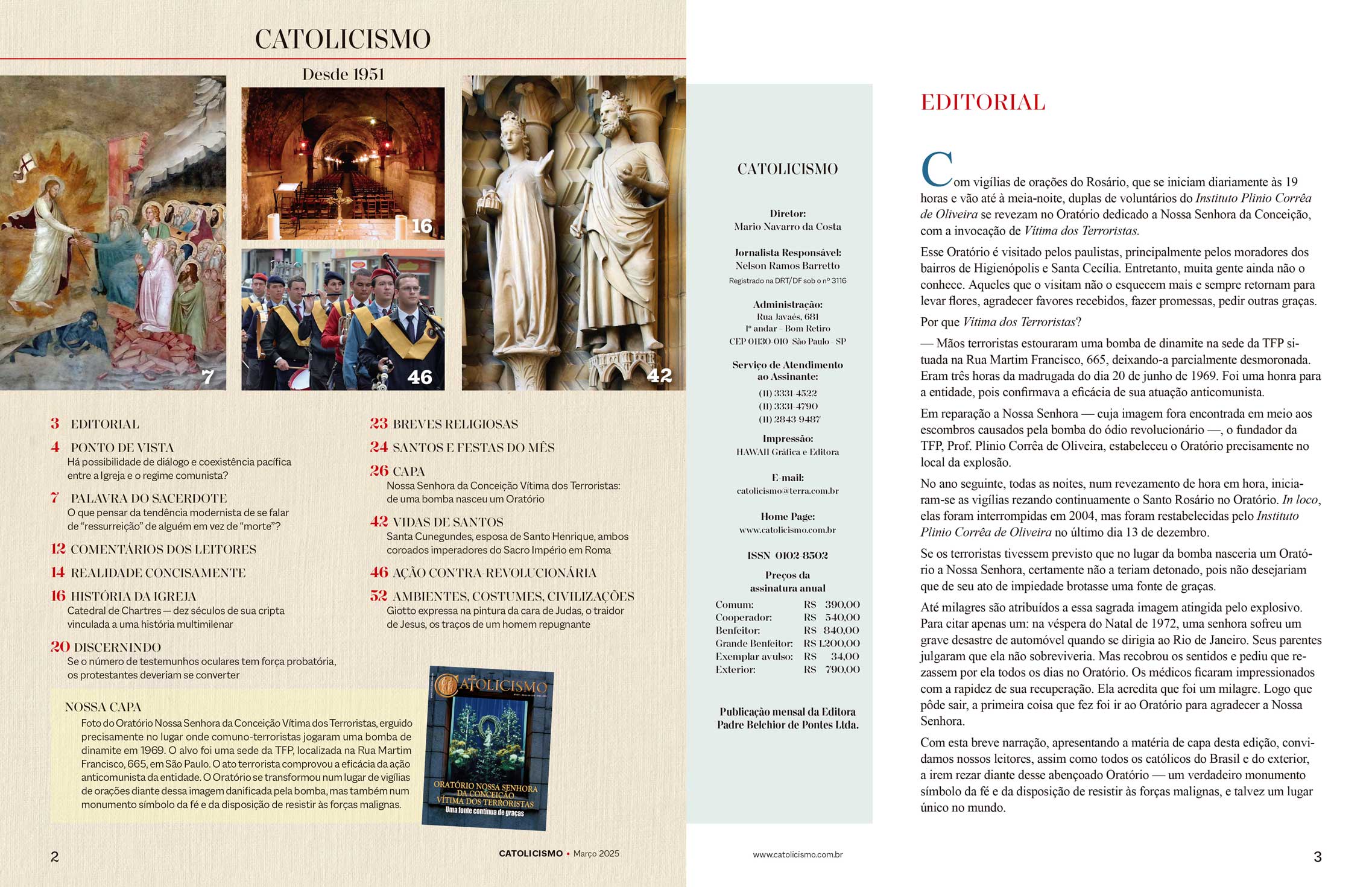 Com esta breve narração, apresentando a matéria de capa desta edição, convidamos nossos leitores, assim como todos os católicos do Brasil e do exterior, a irem rezar diante desse abençoado Oratório — um verdadeiro monumento símbolo da fé e da disposição de resistir às forças malignas, e talvez um lugar único no mundo.