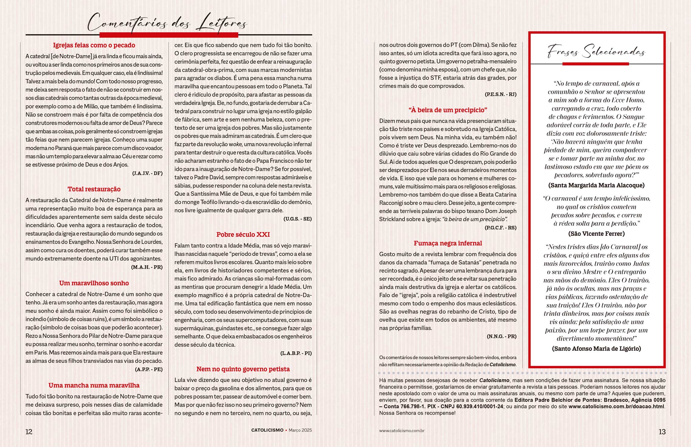 Tudo foi tão bonito na restauração de Notre-Dame que me deixava surpreso, pois nesses dias de calamidade coisas tão bonitas e perfeitas são muito raras acontecer. Eis que fico sabendo que nem tudo foi tão bonito. O clero progressista se encarregou de não se fazer uma cerimônia perfeita, fez questão de enfear a reinauguração da catedral-obra-prima, com suas marcas modernistas para agradar os diabos. É uma pena essa mancha numa maravilha que encantou pessoas em todo o Planeta. Tal clero é ridículo de propósito, para afastar as pessoas da verdadeira Igreja. Ele, no fundo, gostaria de derrubar a Catedral para construir no lugar uma igreja no estilo galpão de fábrica, sem arte e sem nenhuma beleza, com o pretexto de ser uma igreja dos pobres. Mas são justamente os pobres que mais admiram as catedrais. É um clero que faz parte da revolução woke, uma nova revolução infernal para tentar destruir o que resta da cultura católica. Vocês não acharam estranho o fato de o Papa Francisco não ter ido para a inauguração de Notre-Dame? Se for possível, talvez o Padre David, sempre com respostas admiráveis e sábias, pudesse responder na coluna dele nesta revista. Que a Santíssima Mãe de Deus, e que foi também mãe do monge Teófilo livrando-o da escravidão do demônio, nos livre igualmente de qualquer garra dele. (U.G.S. - SE)