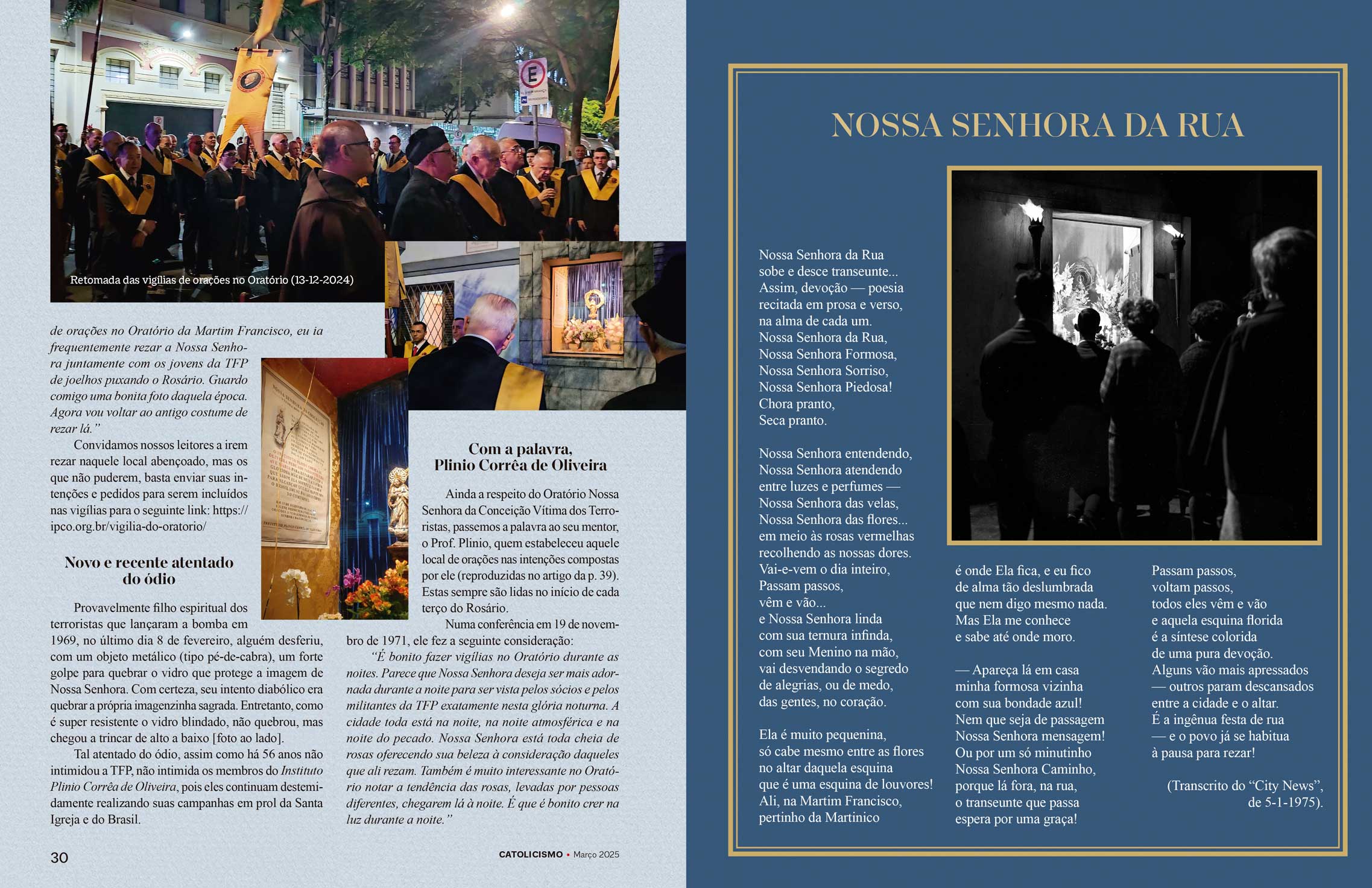 Ainda a respeito do Oratório Nossa Senhora da Conceição Vítima dos Terroristas, passemos a palavra ao seu mentor, o Prof. Plinio, quem estabeleceu aquele local de orações nas intenções compostas por ele (reproduzidas no artigo da p. 39). Estas sempre são lidas no início de cada terço do Rosário.