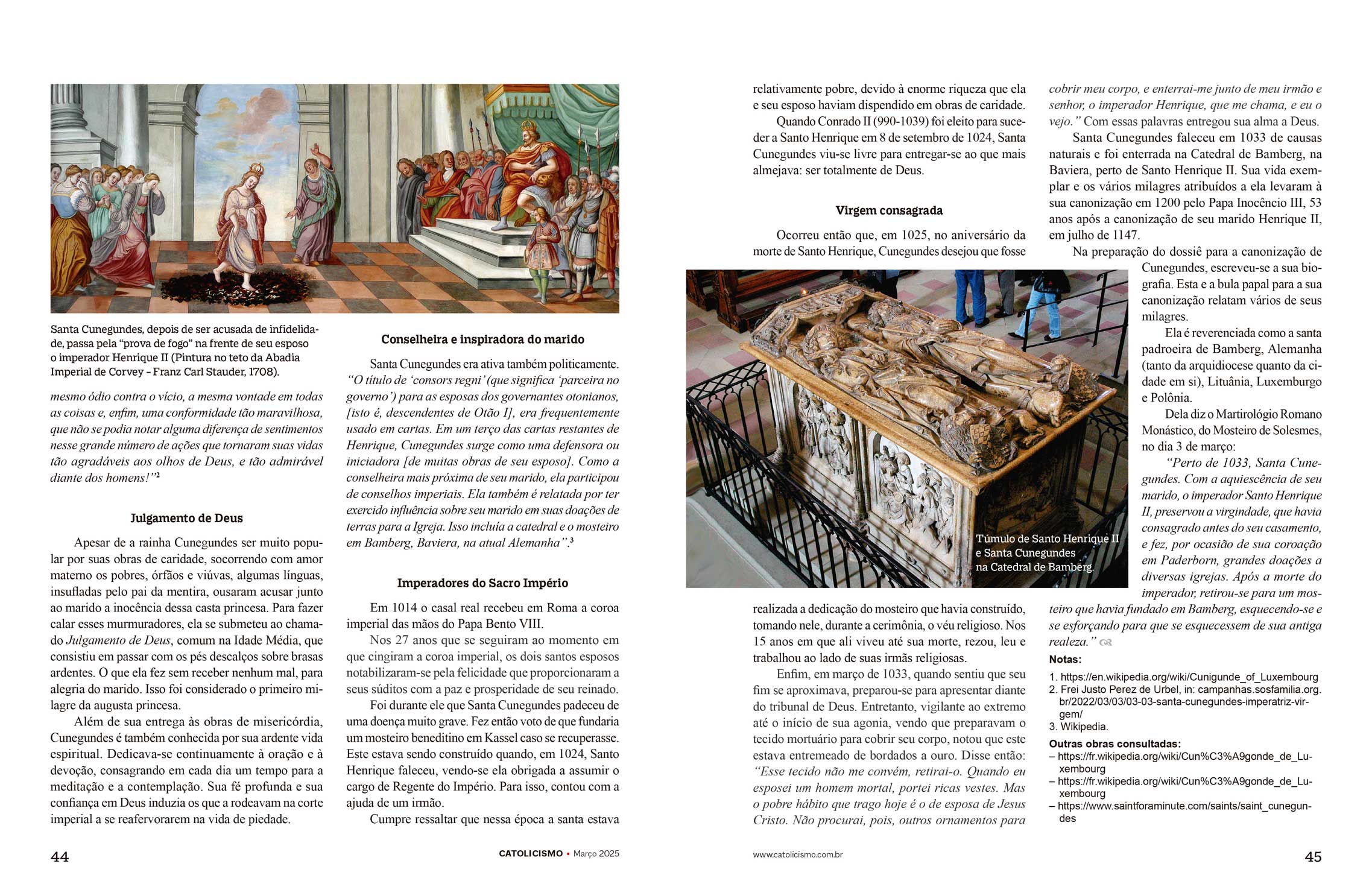 “Perto de 1033, Santa Cunegundes. Com a aquiescência de seu marido, o imperador Santo Henrique II, preservou a virgindade, que havia consagrado antes do seu casamento, e fez, por ocasião de sua coroação em Paderborn, grandes doações a diversas igrejas. Após a morte do imperador, retirou-se para um mosteiro que havia fundado em Bamberg, esquecendo-se e se esforçando para que se esquecessem de sua antiga realeza.”