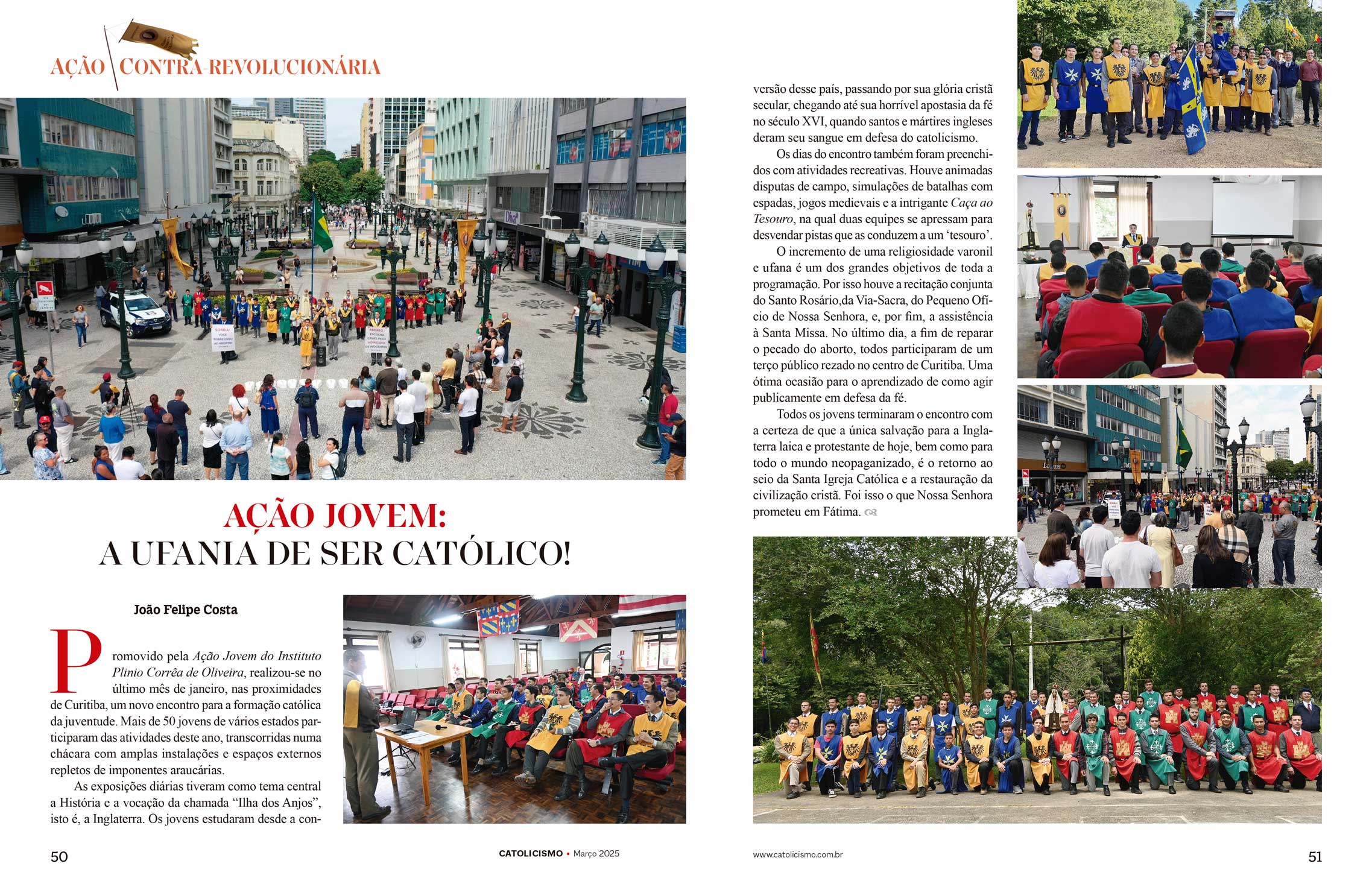 Promovido pela Ação Jovem do Instituto Plinio Corrêa de Oliveira, realizou-se no último mês de janeiro, nas proximidades de Curitiba, um novo encontro para a formação católica da juventude. Mais de 50 jovens de vários estados participaram das atividades deste ano, transcorridas numa chácara com amplas instalações e espaços externos repletos de imponentes araucárias.