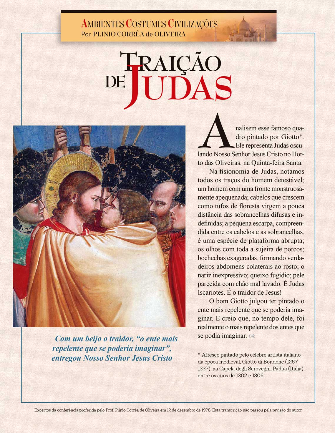 Analisem esse famoso quadro pintado por Giotto*. Ele representa Judas osculando Nosso Senhor Jesus Cristo no Horto das Oliveiras, na Quinta-feira Santa.