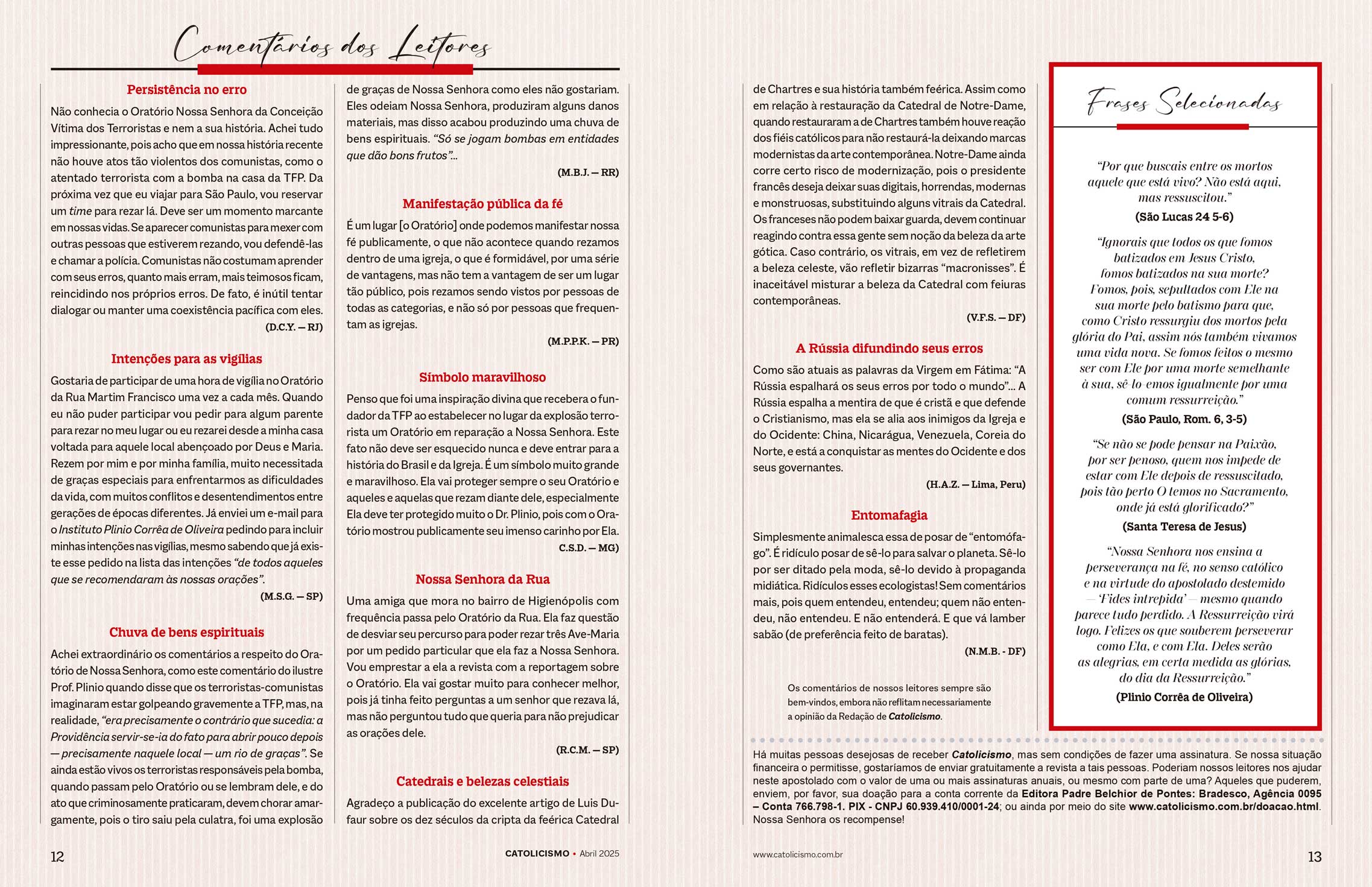 Achei extraordinário os comentários a respeito do Oratório de Nossa Senhora, como este comentário do ilustre Prof. Plinio quando disse que os terroristas-comunistas imaginaram estar golpeando gravemente a TFP, mas, na realidade, "era precisamente o contrário que sucedia: a Providência servir-se-ia do fato para abrir pouco depois — precisamente naquele local — um rio de graças". Se ainda estão vivos os terroristas responsáveis pela bomba, quando passam pelo Oratório ou se lembram dele, e do ato que criminosamente praticaram, devem chorar amargamente, pois o tiro saiu pela culatra, foi uma explosão de graças de Nossa Senhora como eles não gostariam. Eles odeiam Nossa Senhora, produziram alguns danos materiais, mas disso acabou produzindo uma chuva de bens espirituais. "Só se jogam bombas em entidades que dão bons frutos"... (M.B.J. — RR)