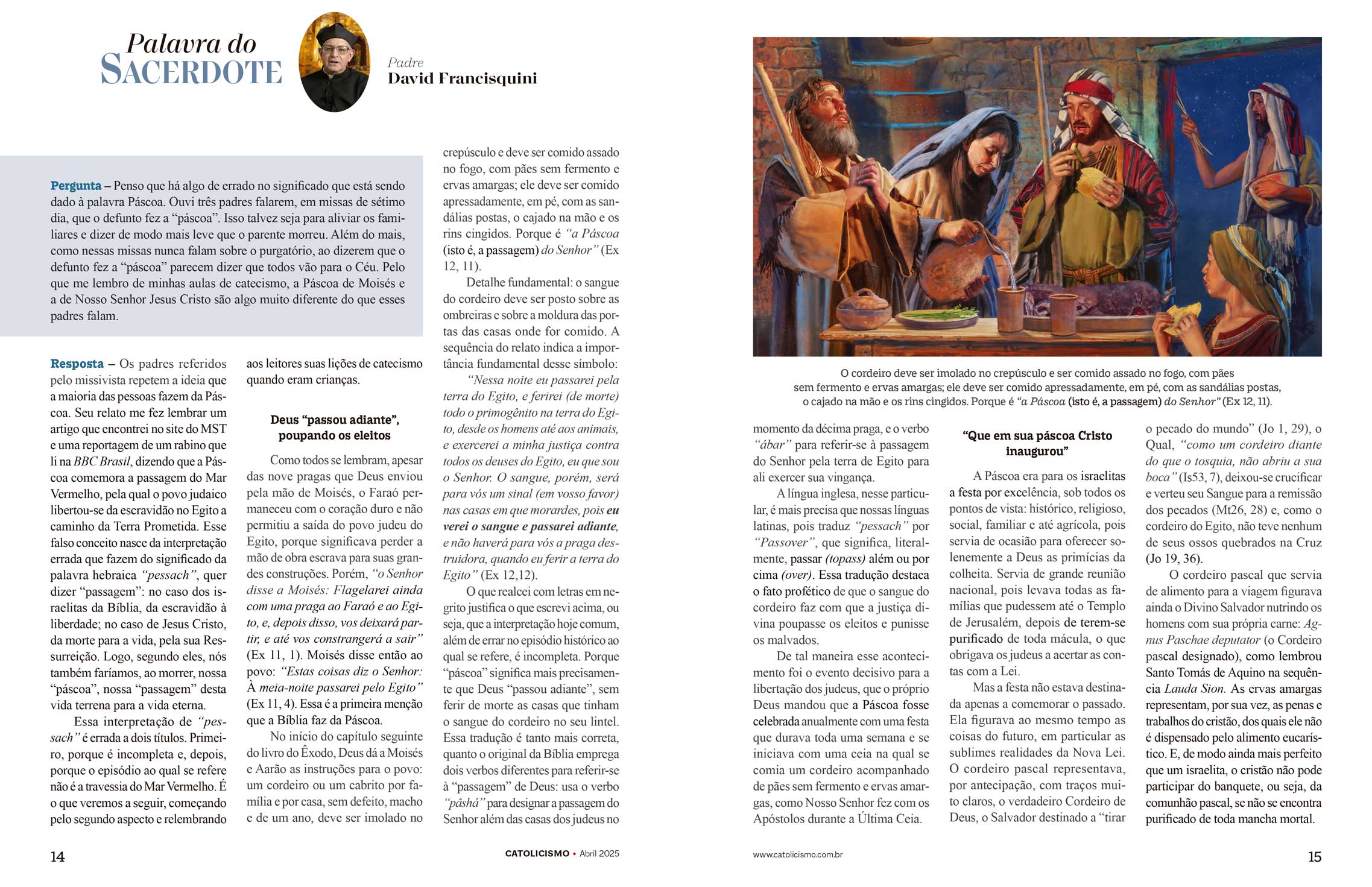 PERGUNTA – Penso que há algo de errado no significado que está sendo dado à palavra Páscoa. Ouvi três padres falarem, em missas de sétimo dia, que o defunto fez a "páscoa". Isso talvez seja para aliviar os familiares e dizer de modo mais leve que o parente morreu. Além do mais, como nessas missas nunca falam sobre o purgatório, ao dizerem que o defunto fez a "páscoa" parecem dizer que todos vão para o Céu. Pelo que me lembro de minhas aulas de catecismo, a Páscoa de Moisés e a de Nosso Senhor Jesus Cristo são algo muito diferente do que esses padres falam.