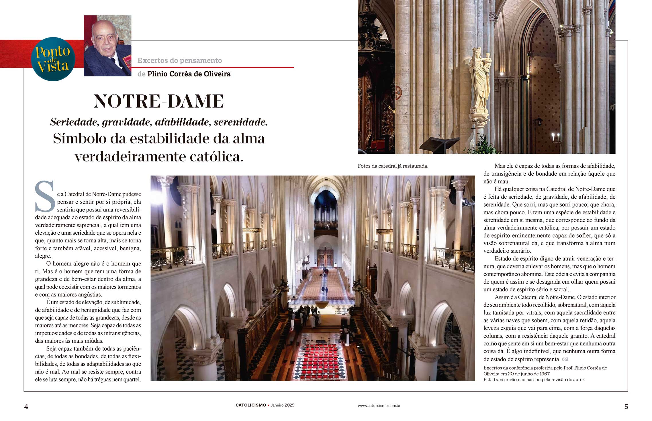 Há qualquer coisa na Catedral de Notre-Dame que é feita de seriedade, de gravidade, de afabilidade, de serenidade. Que sorri, mas que sorri pouco; que chora, mas chora pouco. E tem uma espécie de estabilidade e serenidade em si mesma, que corresponde ao fundo da alma verdadeiramente católica, por possuir um estado de espírito eminentemente capaz de sofrer, que só a visão sobrenatural dá, e que transforma a alma num verdadeiro sacrário.