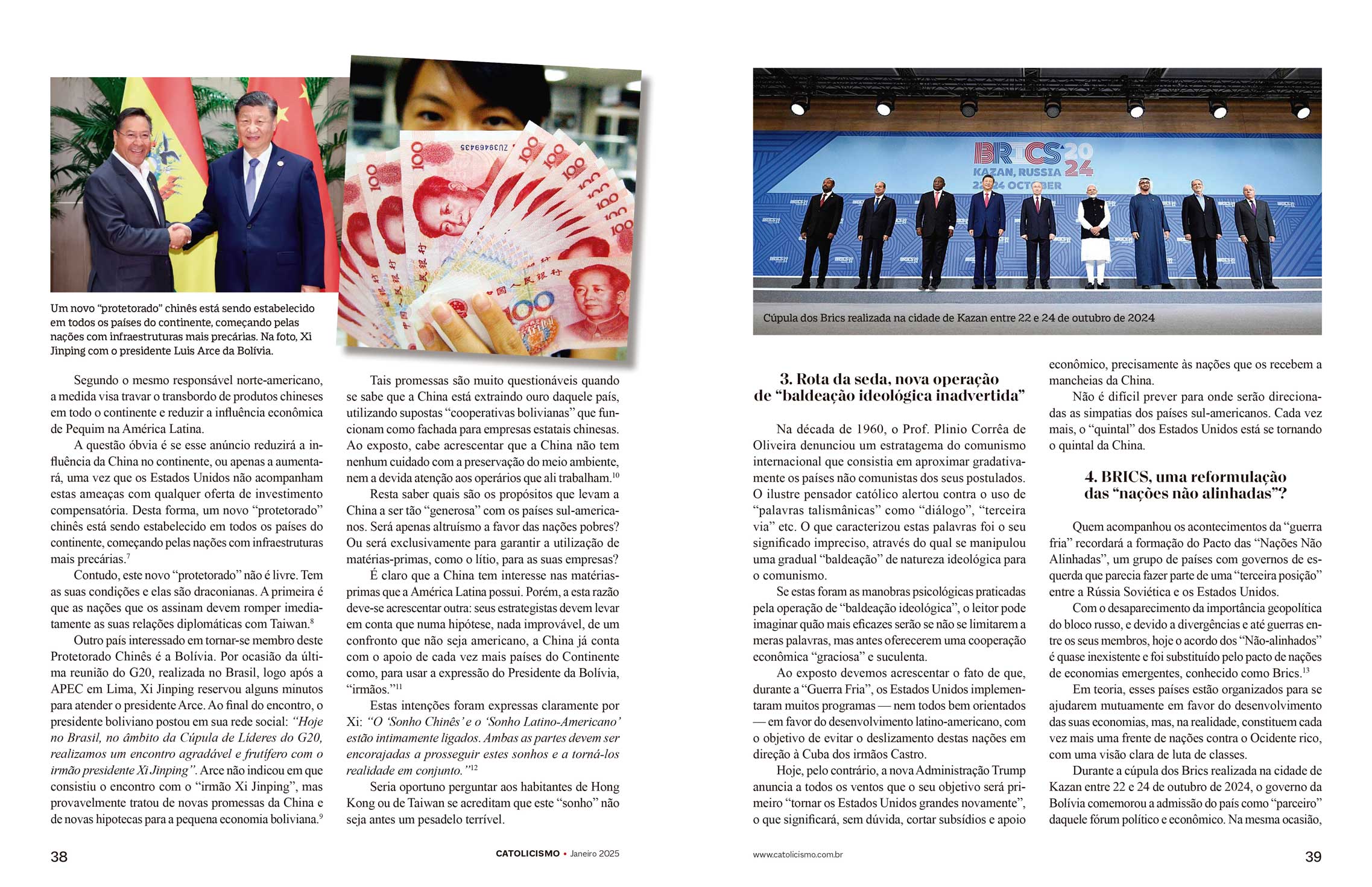 Outro país interessado em tornar-se membro deste Protetorado Chinês é a Bolívia. Por ocasião da última reunião do G20, realizada no Brasil, logo após a APEC em Lima, Xi Jinping reservou alguns minutos para atender o presidente Arce. Ao final do encontro, o presidente boliviano postou em sua rede social: “Hoje no Brasil, no âmbito da Cúpula de Líderes do G20, realizamos um encontro agradável e frutífero com o irmão presidente Xi Jinping”. Arce não indicou em que consistiu o encontro com o “irmão Xi Jinping”, mas provavelmente tratou de novas promessas da China e de novas hipotecas para a pequena economia boliviana.9