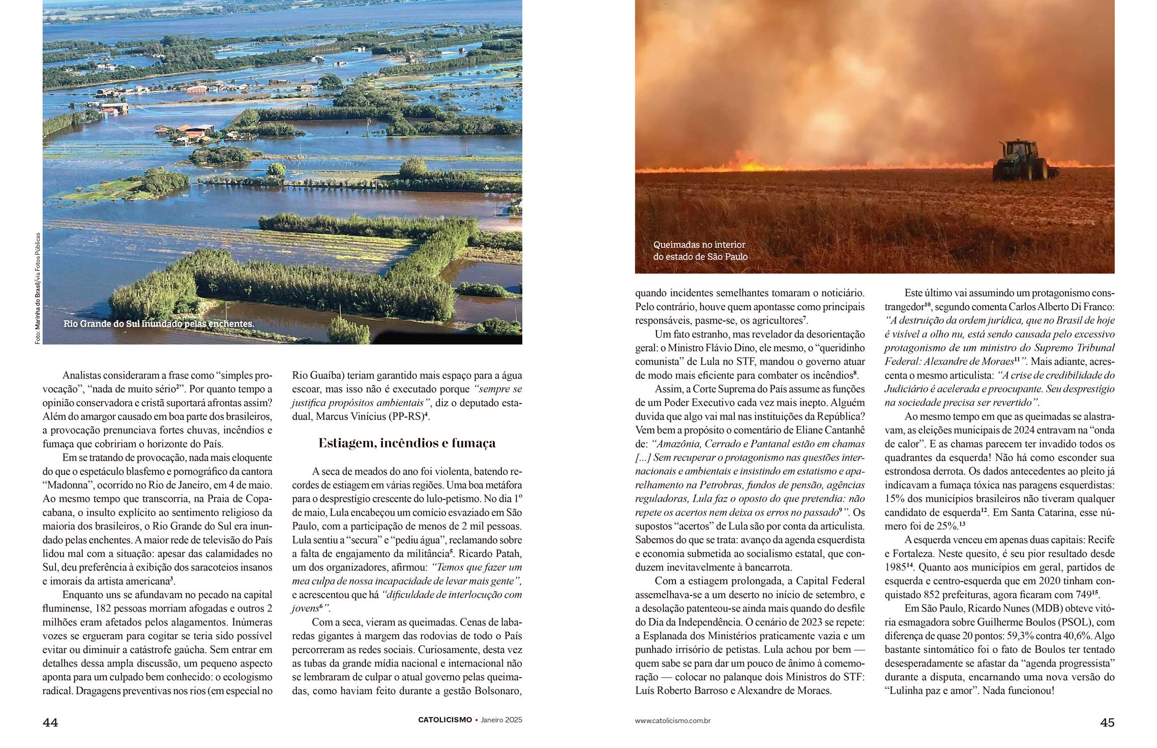 Enquanto uns se afundavam no pecado na capital fluminense, 182 pessoas morriam afogadas e outros 2 milhões eram afetados pelos alagamentos. Inúmeras vozes se ergueram para cogitar se teria sido possível evitar ou diminuir a catástrofe gaúcha. Sem entrar em detalhes dessa ampla discussão, um pequeno aspecto aponta para um culpado bem conhecido: o ecologismo radical. Dragagens preventivas nos rios (em especial no Rio Guaíba) teriam garantido mais espaço para a água escoar, mas isso não é executado porque “sempre se justifica propósitos ambientais”, diz o deputado estadual, Marcus Vinícius (PP-RS)4.