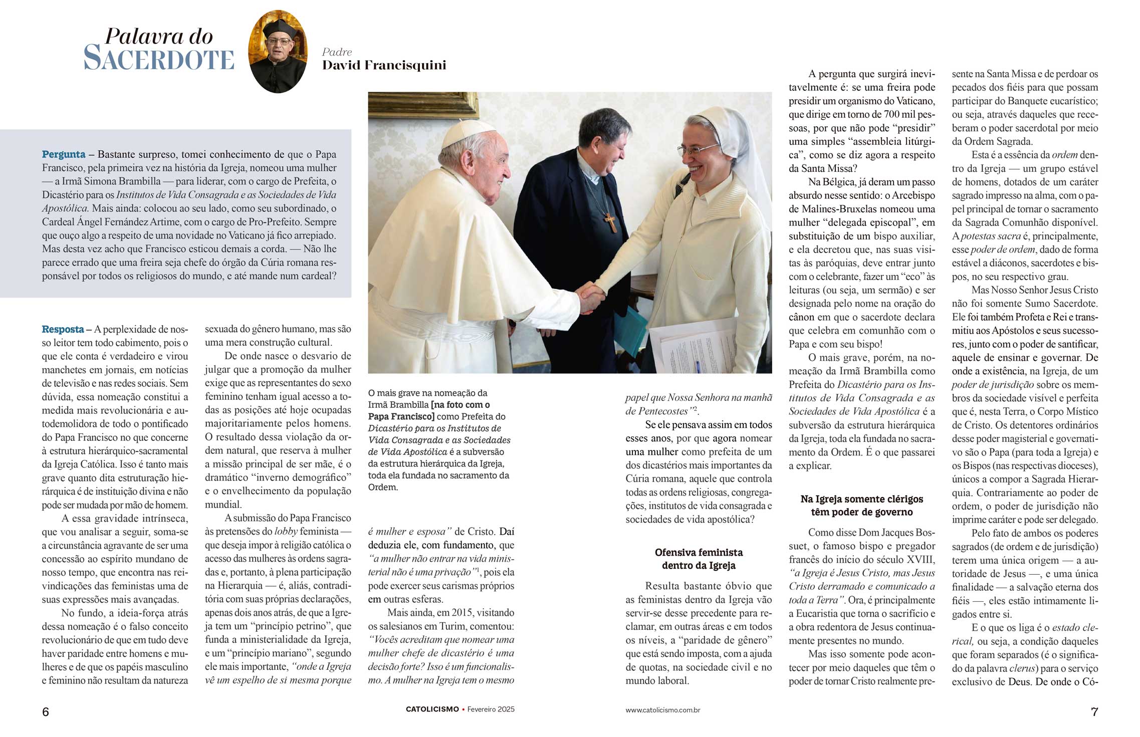 PERGUNTA – Bastante surpreso, tomei conhecimento de que o Papa Francisco, pela primeira vez na história da Igreja, nomeou uma mulher — a Irmã Simona Brambilla — para liderar, com o cargo de Prefeita, o Dicastério para os Institutos de Vida Consagrada e as Sociedades de Vida Apostólica. Mais ainda: colocou ao seu lado, como seu subordinado, o Cardeal Ángel Fernández Artime, com o cargo de Pro-Prefeito. Sempre que ouço algo a respeito de uma novidade no Vaticano já fico arrepiado. Mas desta vez acho que Francisco esticou demais a corda. — Não lhe parece errado que uma freira seja chefe do órgão da Cúria romana responsável por todos os religiosos do mundo, e até mande num cardeal?