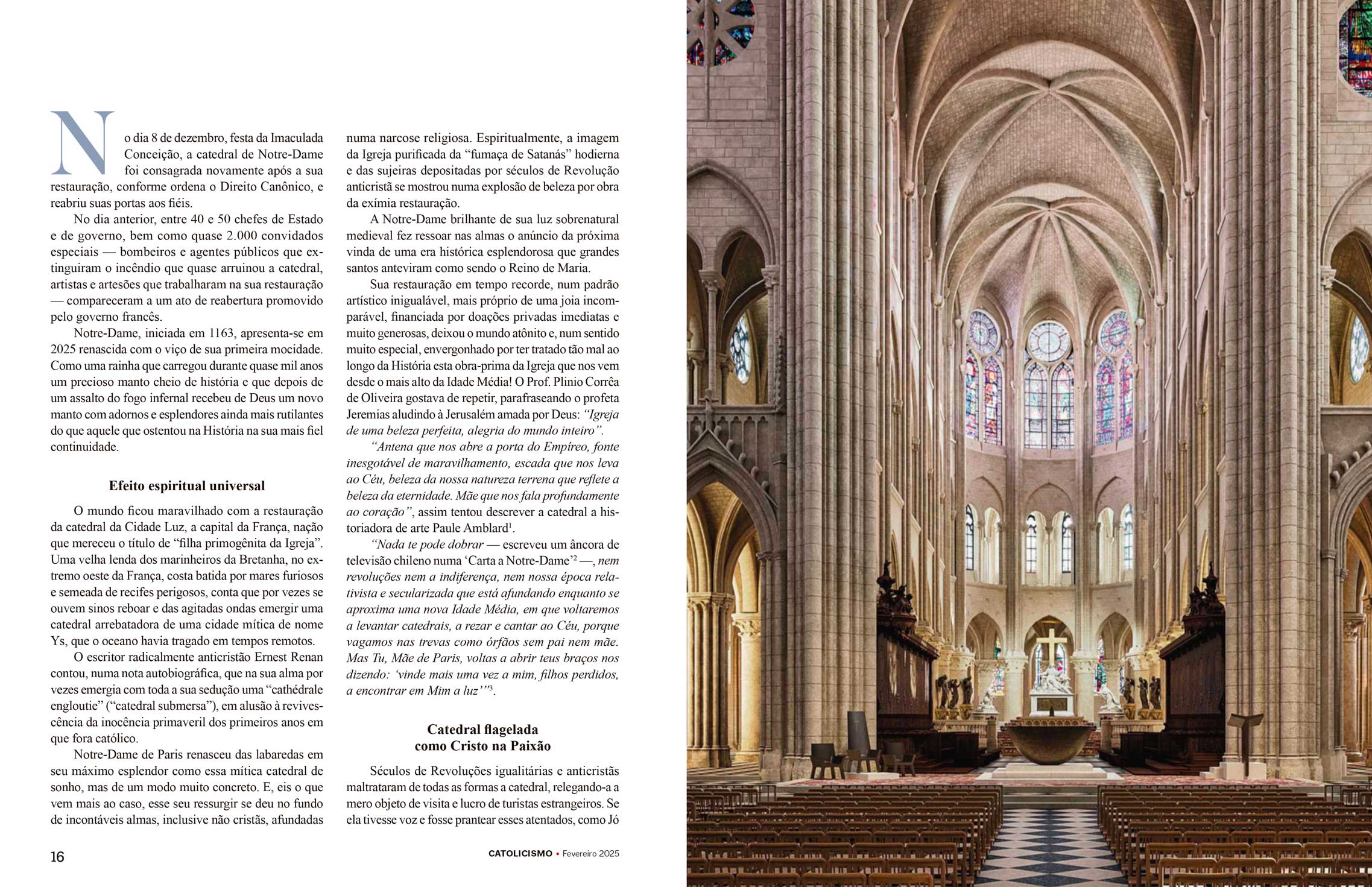 Notre-Dame, iniciada em 1163, apresenta-se em 2025 renascida com o viço de sua primeira mocidade. Como uma rainha que carregou durante quase mil anos um precioso manto cheio de história e que depois de um assalto do fogo infernal recebeu de Deus um novo manto com adornos e esplendores ainda mais rutilantes do que aquele que ostentou na História na sua mais fiel continuidade.
