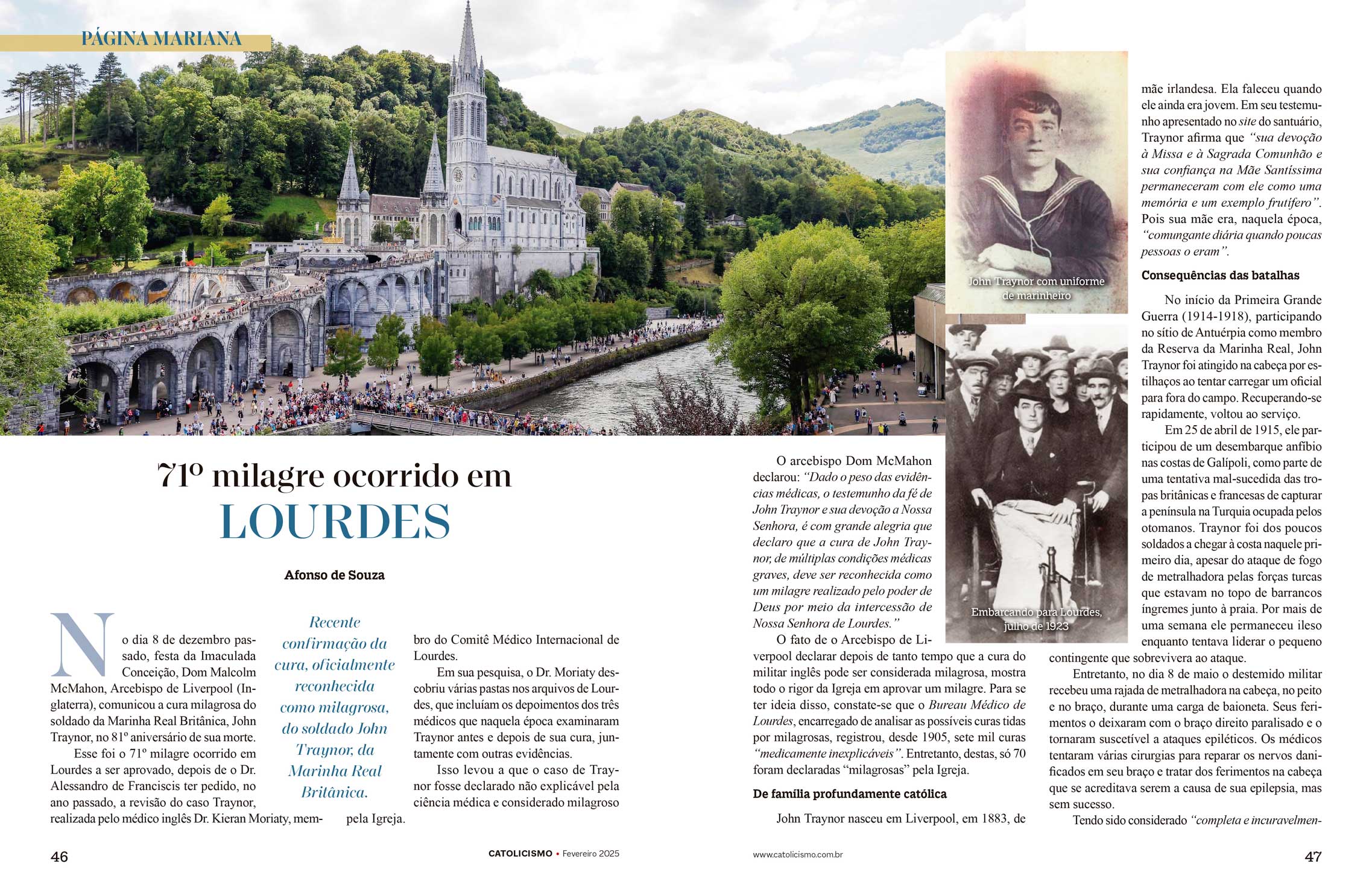 Recente confirmação da cura, oficialmente reconhecida como milagrosa, do soldado John Traynor, da Marinha Real Britânica.
