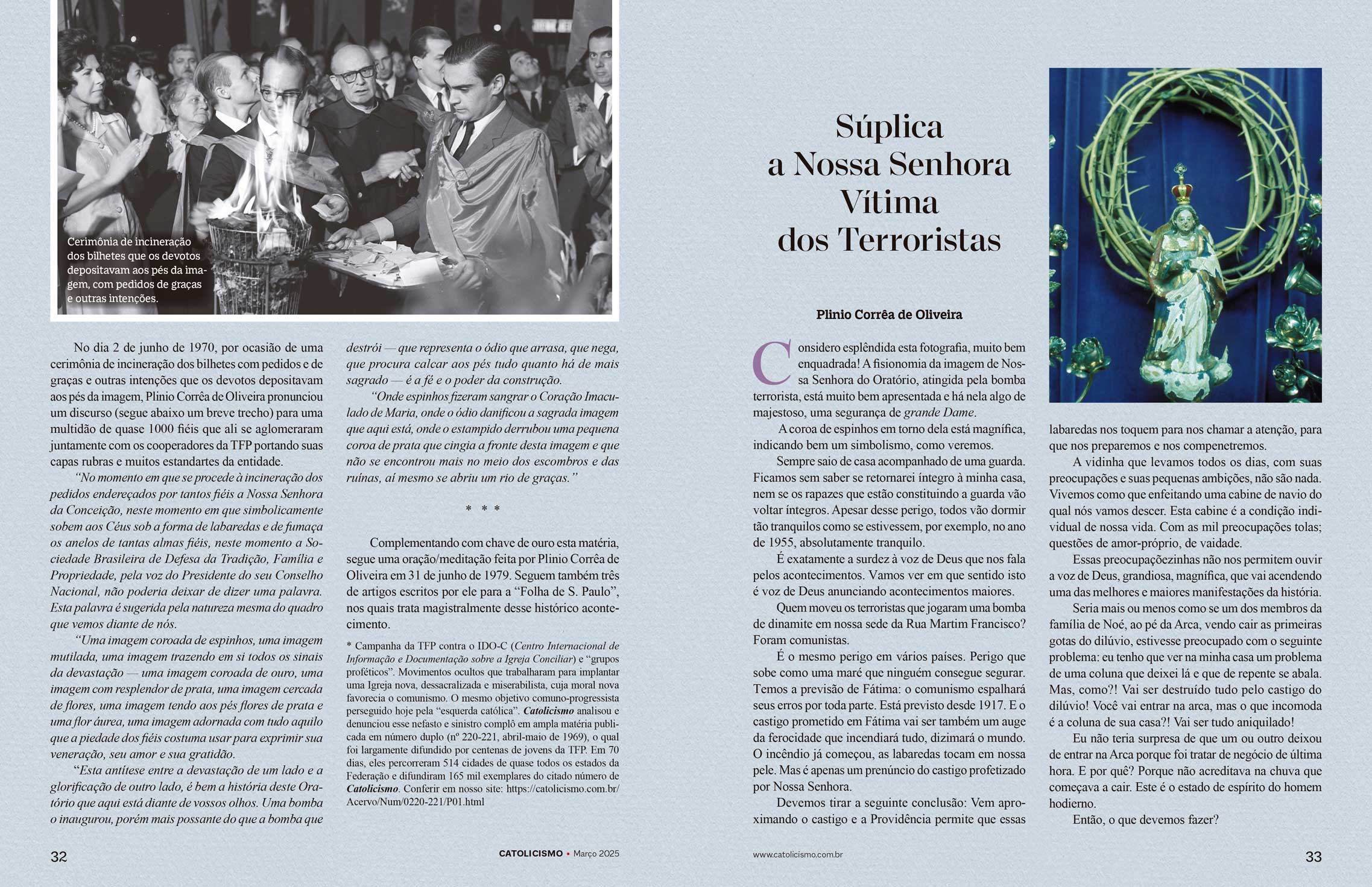 No dia 2 de junho de 1970, por ocasião de uma cerimônia de incineração dos bilhetes com pedidos e de graças e outras intenções que os devotos depositavam aos pés da imagem, Plinio Corrêa de Oliveira pronunciou um discurso (segue abaixo um breve trecho) para uma multidão de quase 1000 fiéis que ali se aglomeraram juntamente com os cooperadores da TFP portando suas capas rubras e muitos estandartes da entidade.