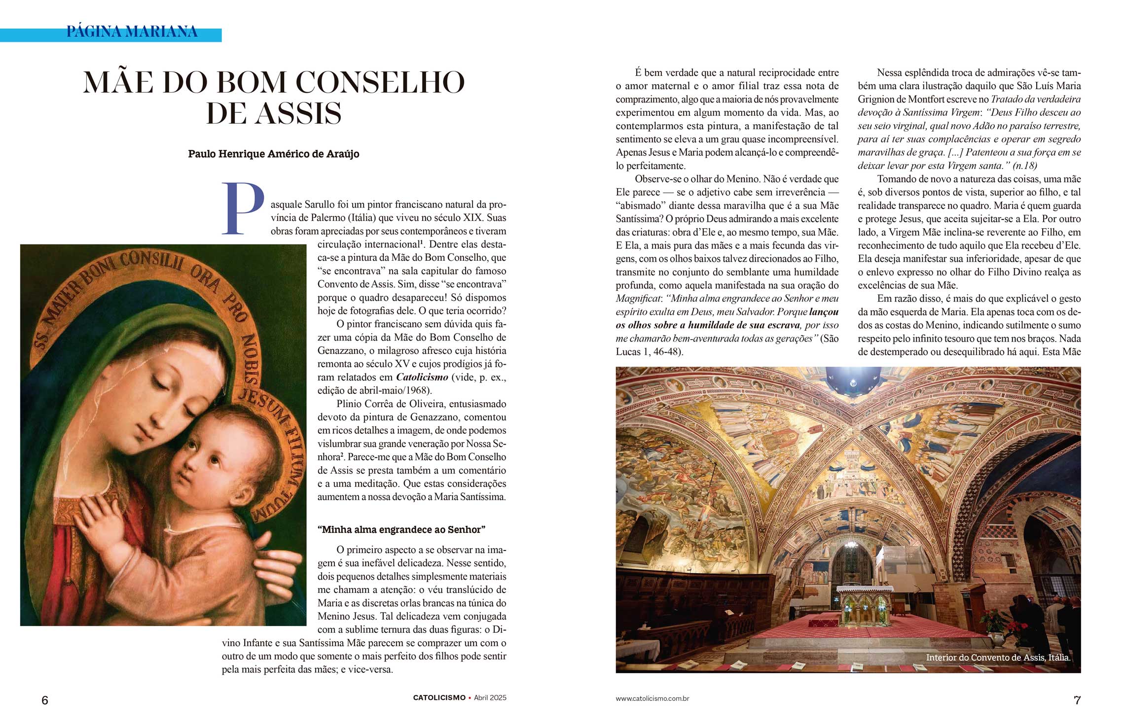 Plinio Corrêa de Oliveira, entusiasmado devoto da pintura de Genazzano, comentou em ricos detalhes a imagem, de onde podemos vislumbrar sua grande veneração por Nossa Senhora2. Parece-me que a Mãe do Bom Conselho de Assis se presta também a um comentário e a uma meditação. Que estas considerações aumentem a nossa devoção a Maria Santíssima.