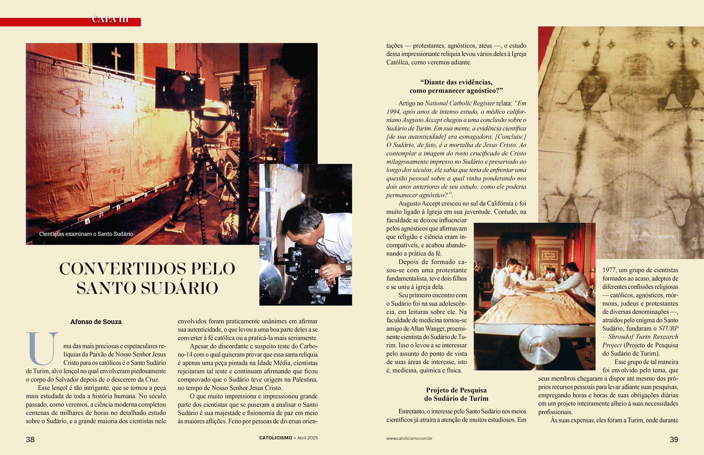 O que muito impressiona e impressionou grande parte dos cientistas que se puseram a analisar o Santo Sudário é sua majestade e fisionomia de paz em meio às maiores aflições. Feito por pessoas de diversas orientações — protestantes, agnósticos, ateus —, o estudo dessa impressionante relíquia levou vários deles à Igreja Católica, como veremos adiante.
